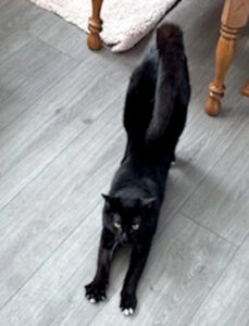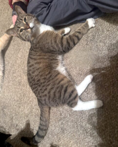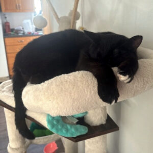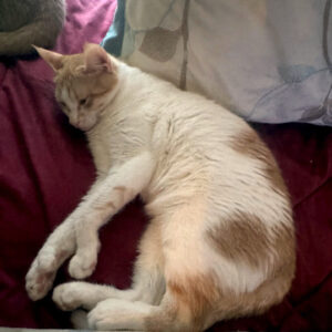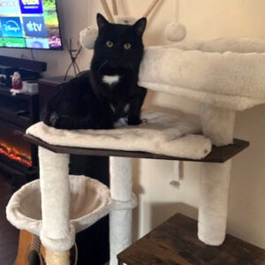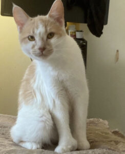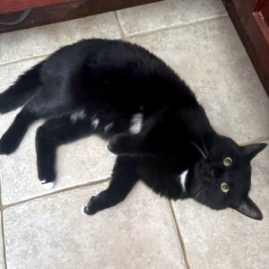 Oreo is a year and 4 months old… good with dogs but must be an only cat!!