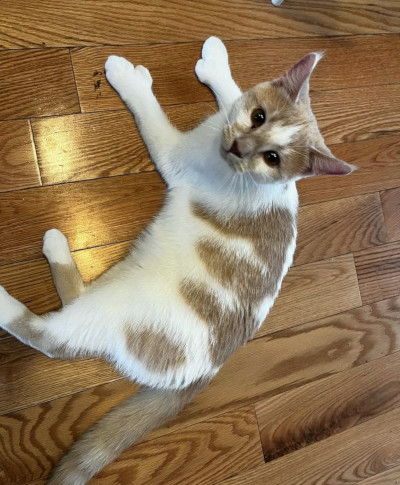 My name is Beth and I am a 10-month-old female domestic shorthair kitten with white and orange fur and adorable feathery white ear tips.