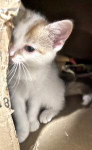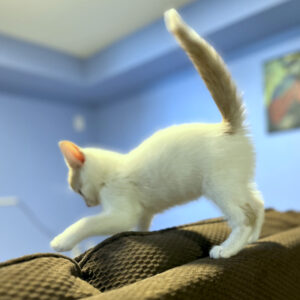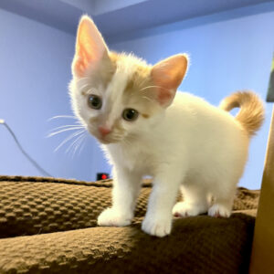 Butter is quite striking with her mostly white fur, orange tail, and orange ears and face.