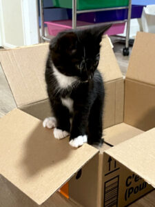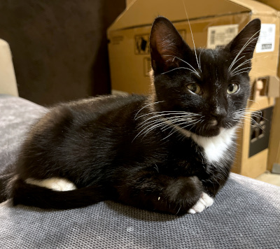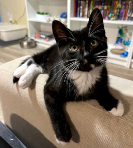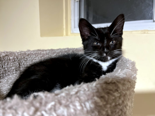 Buttons is an adorable black and white tuxie with a black face and white whiskers.