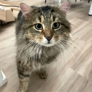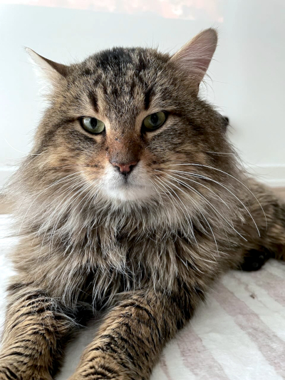 He is a big, handsome boy with plush fur and brown and white tabby markings.