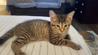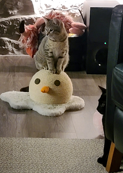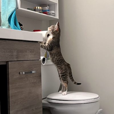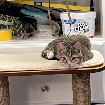 Today she made it upstairs from basement to second floor and is cautiously exploring.