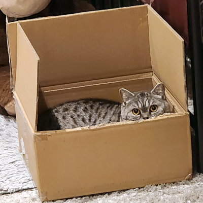 She is eating, drinking and using her litter box. She loves sitting in boxes…lol..