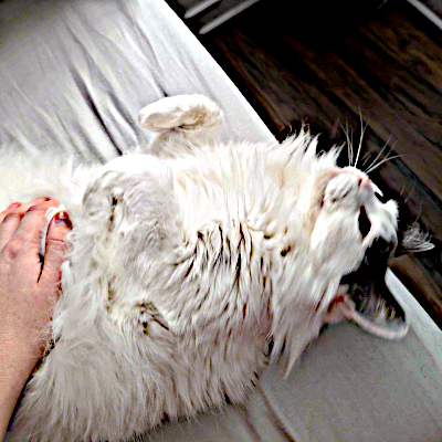 He loves attention and is constantly flopping down for rubs and will follow me wherever I am going in the house.