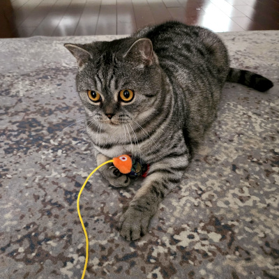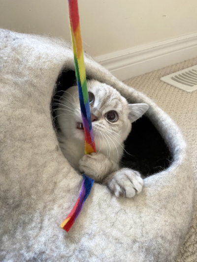 He loves playing with his wand toys, namely anything with feathers .