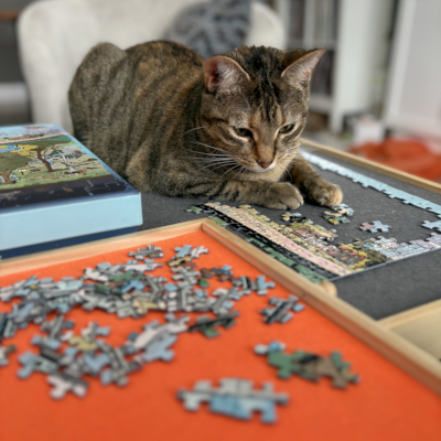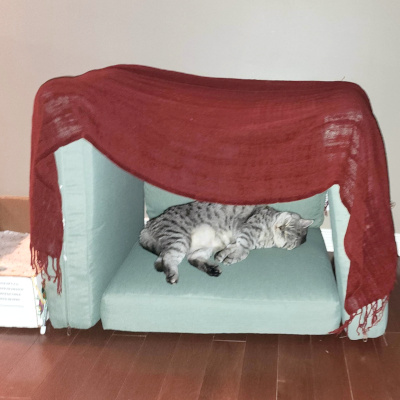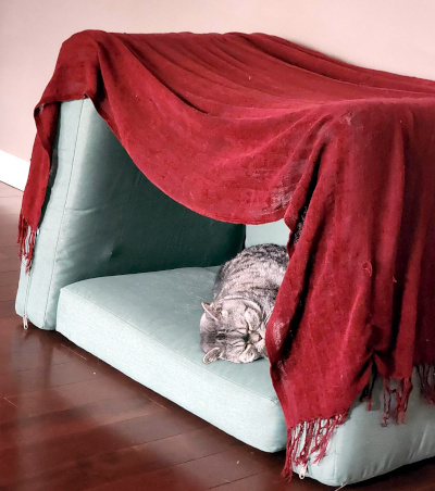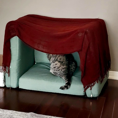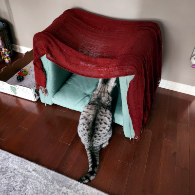 She loves boxes and even though she won’t sleep in her cat bed she loves this fort we made her.